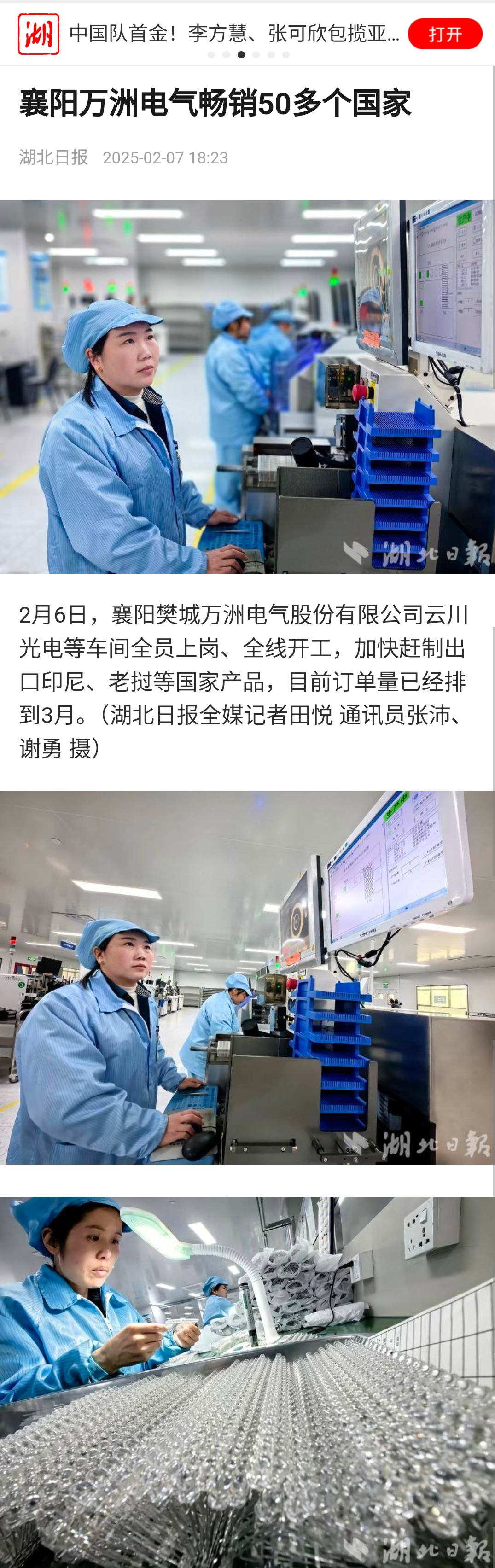 2月6日,襄陽樊城萬洲電氣股份有限公司云川光電等車間全員上崗、全線開工,加快趕制出口印尼、老撾等國家產品,目前訂單量已經排到3月。