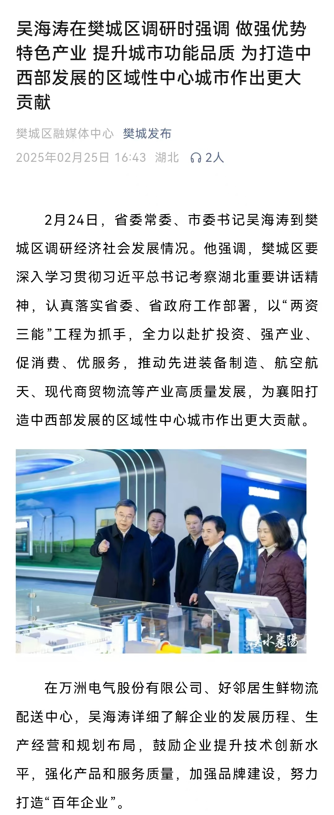 2月24日,省委常委、市委書記吳海濤到樊城區(qū)調(diào)研經(jīng)濟(jì)社會發(fā)展情況。他強(qiáng)調(diào),樊城區(qū)要深入學(xué)習(xí)貫徹習(xí)近平總書記考察湖北重要講話精神,認(rèn)真落實(shí)省委、省政府工作部署,以“兩資三能”工程為抓手,全力以赴擴(kuò)投資、強(qiáng)產(chǎn)業(yè)、促消費(fèi)、優(yōu)服務(wù),推動先進(jìn)裝備制造、航空航天、現(xiàn)代商貿(mào)物流等產(chǎn)業(yè)高質(zhì)量發(fā)展,為襄陽打造中西部發(fā)展的區(qū)域性中心城市作出更大貢獻(xiàn)。