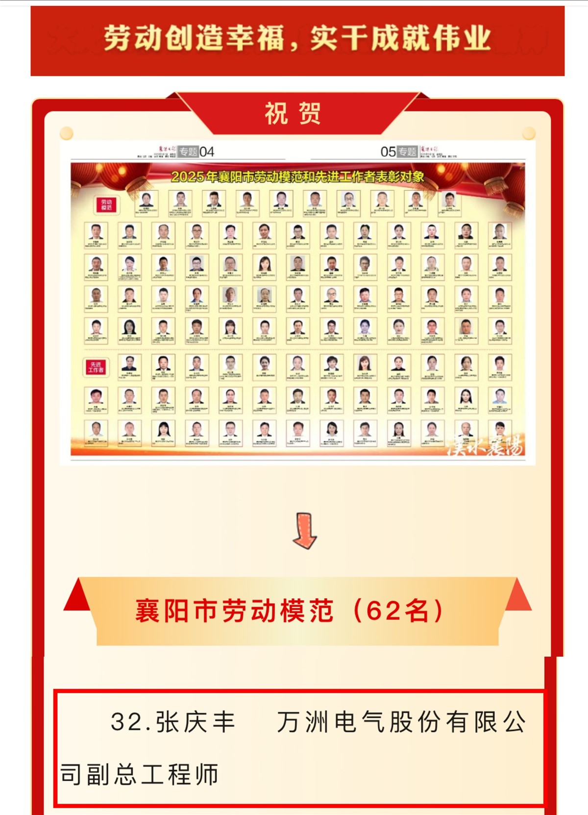 奮斗書(shū)寫(xiě)輝煌,勞動(dòng)創(chuàng)造未來(lái)。5月2日,襄陽(yáng)市公布了2025年度市勞動(dòng)模范和先進(jìn)工作者表彰名單,萬(wàn)洲電氣股份有限公司副總工程師張慶豐被評(píng)為襄陽(yáng)市勞動(dòng)模范。