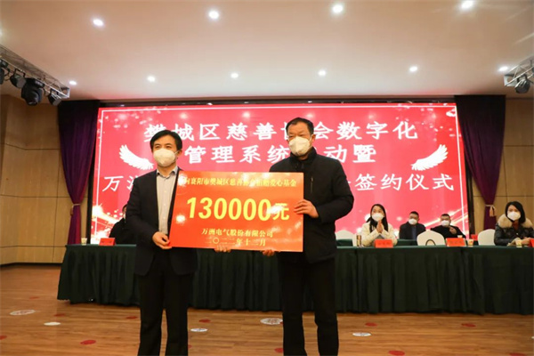 萬洲電氣為樊城區慈善協會捐款13萬元成立“萬洲電氣公益基金”并獲“慈善愛心單位”榮譽稱號。萬洲電氣董事長、總經理趙世運參加簽約儀式。